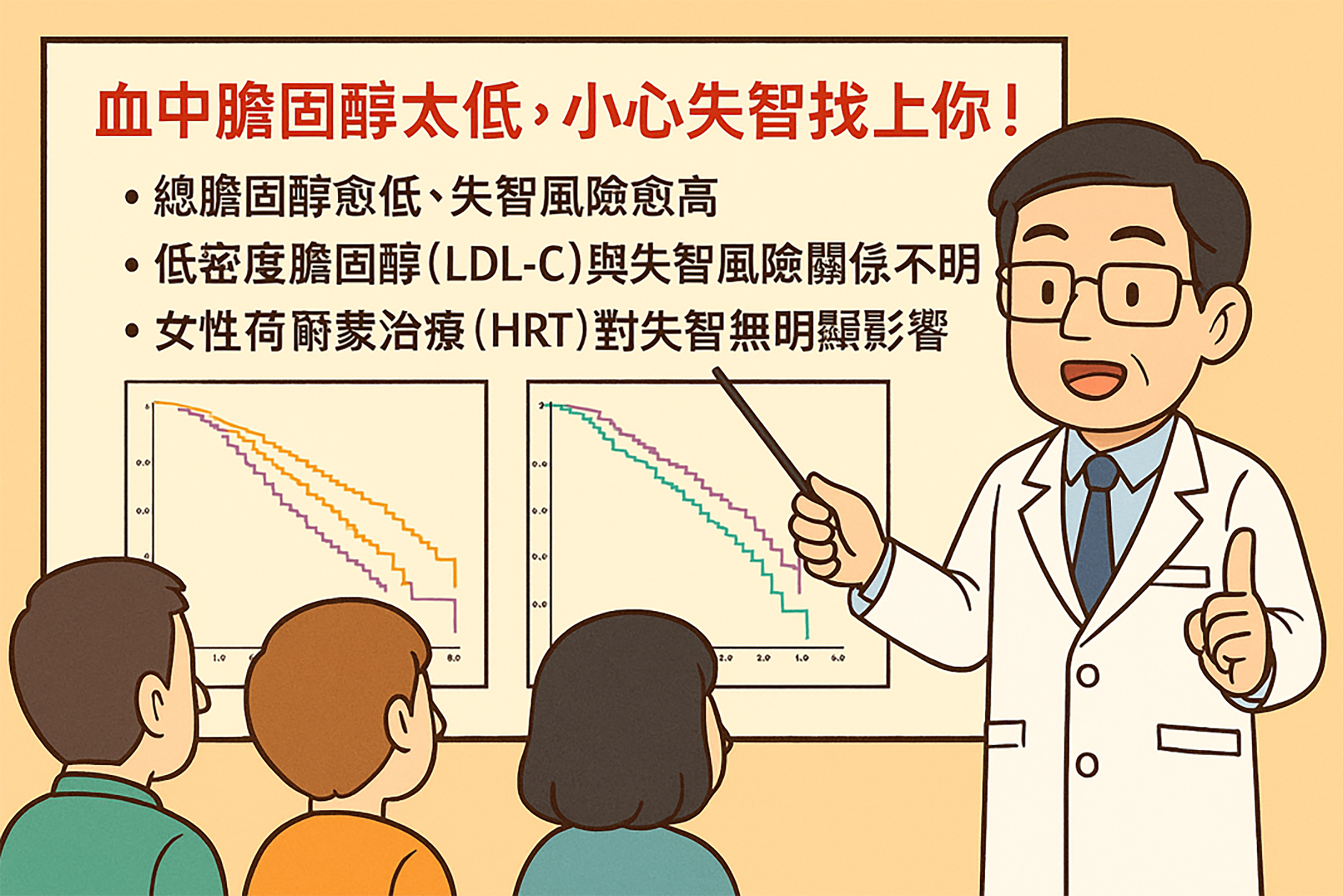 我們團隊分析了台灣秀傳醫療體系中787位50歲以上、尚未失智的停經女性,平均追蹤3年,發現總膽固醇(TC)最低的那一組,失智的風險比起其他組明顯提高。以下是主要的研究結果: